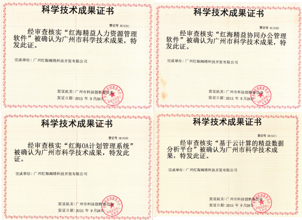 紅??萍紝?015年度已完成及重點(diǎn)優(yōu)化已進(jìn)行一定程度市場(chǎng)推廣的產(chǎn)品申請了科學(xué)技術(shù)成果登記。廣州市科技創(chuàng )新委員會(huì )通過(guò)對紅??萍嫉募t海精益人力資源管理軟件、紅海協(xié)同辦公管理軟件、紅海OA計劃管理系統等11項成果系列項目證明材料的審查、評定,綜合在庫同行業(yè)產(chǎn)品的信息,最終確認為當前先進(jìn)的產(chǎn)品,給予成果登記并頒發(fā)了相應的證書(shū)。